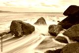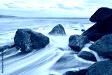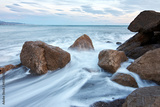 Amazing shot of a rocky shore with smooth waves on background of the boundless sea