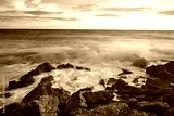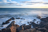 A closeup shot of rocks in the wavy sea under a sunset sky