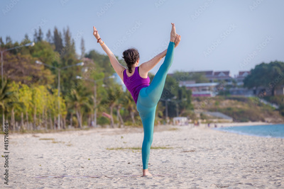 Sport woman yogini pose practice yoga exercise on sand beach near coconut palms in relaxing day , yoga is meditation and healthy sport concept
