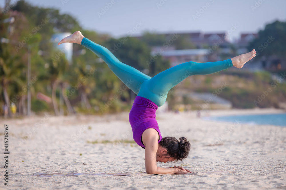 Sport woman yogini pose practice yoga exercise on sand beach near coconut palms in relaxing day , yoga is meditation and healthy sport concept