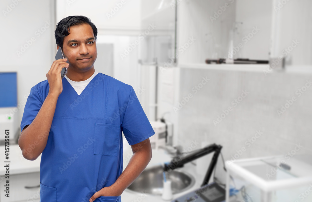 healthcare, profession and medicine concept - happy smiling indian doctor or male nurse in blue uniform with stethoscope calling on smartphone over hospital or laboratory background
