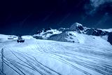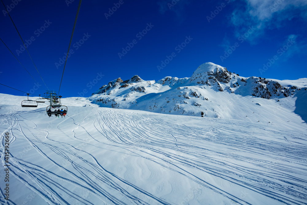 View from ski lift of High mountain panorama and clouds of French Alps tops covered with snow