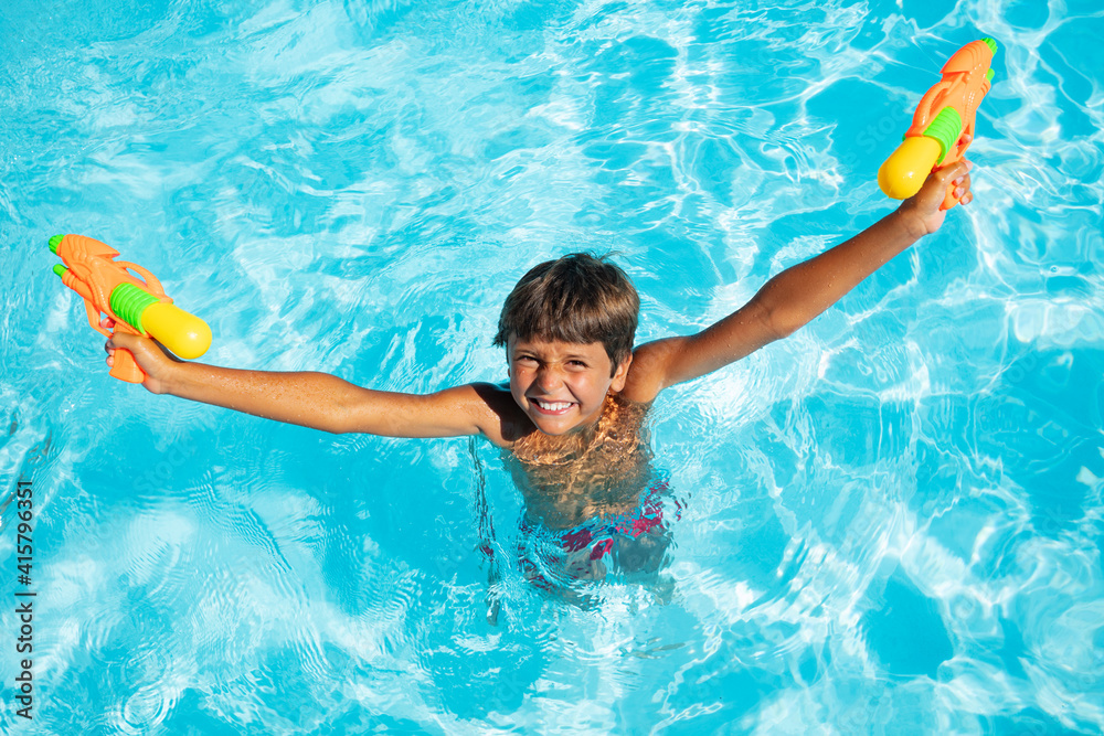 Happy little boy stand in the water of swimming pool playing with water-pistols