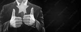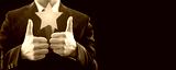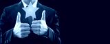 Business man show thumb up good job Success win.five stars, reward, Customer feedback, Recognition employee review.Good Comment First place competition stars. Business Success reviews from customer.