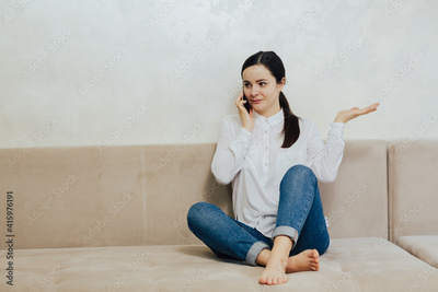 Attractive smiling girl talking on cell phone while sitting on the beige sofa in the living room.