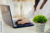 Close up and side view of woman's hands typing on laptop keyboard in the office with decorative plant near.