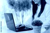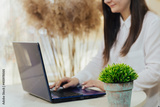 Cropped shot on woman typing on laptop keypad placed on white office desktop with decorative plant.