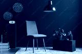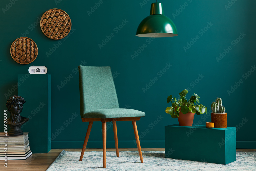 Stylish concept of living room interior with design chair, tropical leaf in beige vase, clock, retro carpet, decoration, pendant lamp and accessories in modern vintage home decor.