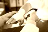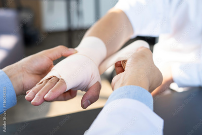 A doctor wrapped around the wrist for first aid Close-up with a particular emphasis on the application of bandages on the patient's hands, first aid concepts and wrist injury treatment.