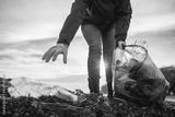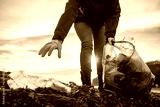 A volunteer collects garbage on a muddy beach. Close-up. The concept of Earth Day. Bottom view