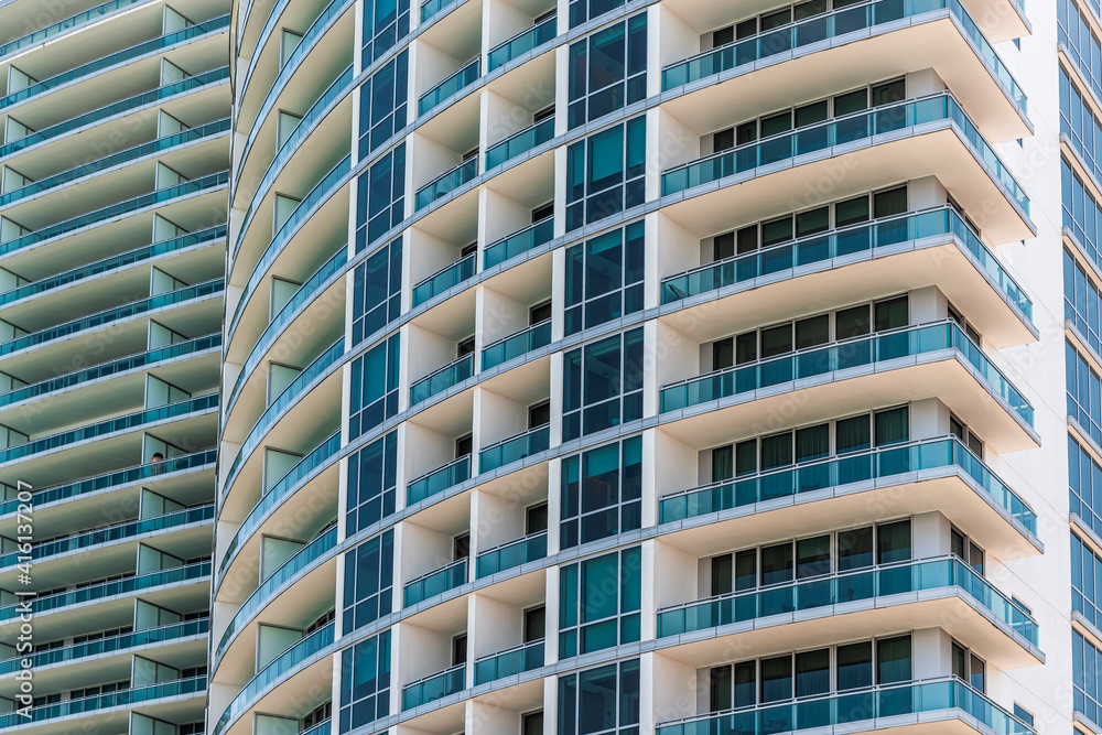 Abstract view on residential apartment condo condominium complex building with windows balconies painted in white blue on sunny day