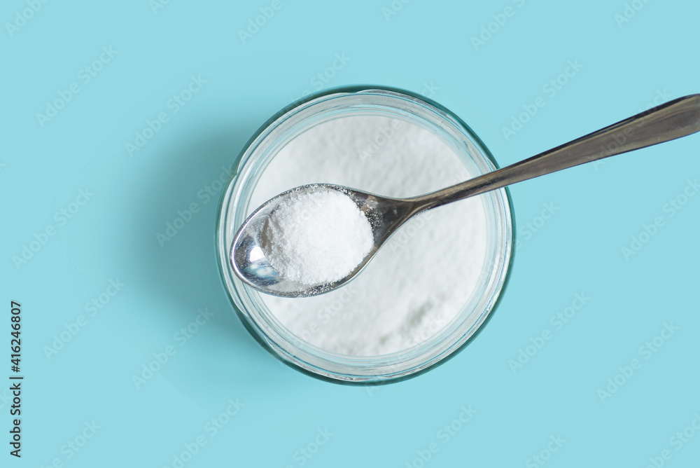 spoon with collagen powder on blue background, top view. Healthy life concept