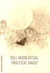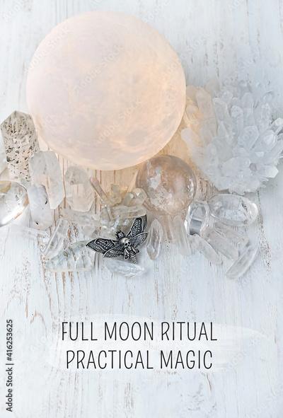 Full Moon Ritual. Practical Magic. metal butterfly, moon lamp and healing gemstones on wooden background. Moon Crystal Ritual, modern magic, spiritual witchcraft