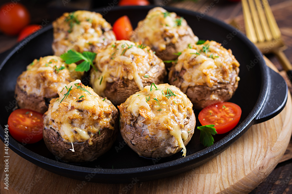 Baked mushrooms stuffed with chicken minced meat, cheese and herbs on a wooden background
