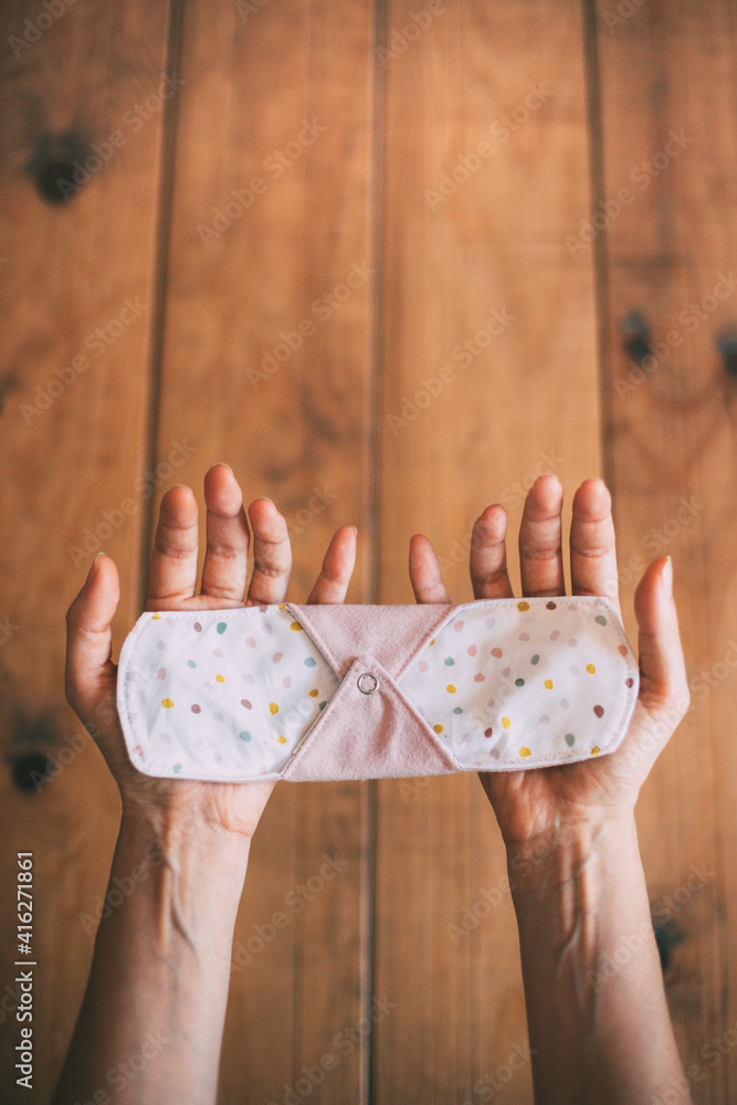 handmade reusable cloth menstrual pad on women's hands. feminine intimate hygiene concept. zero waste concept. environmental sustainability concept. vertical