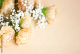 Beige carnation flowers bouquet on light beige background. Selective focus. Holiday decoration concept. Place for text.