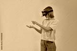 Attractive woman in casual clothes using virtual reality goggles holds something in her palm and tries to touch it isolated on neon pink background. VR headset.