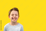 Portrait of a handsome boy closed and screwed up his eyes and laughs with his mouth wide open, a child in a gray shirt smile, positive emotions, childhood, school age. Yellow background, copy space