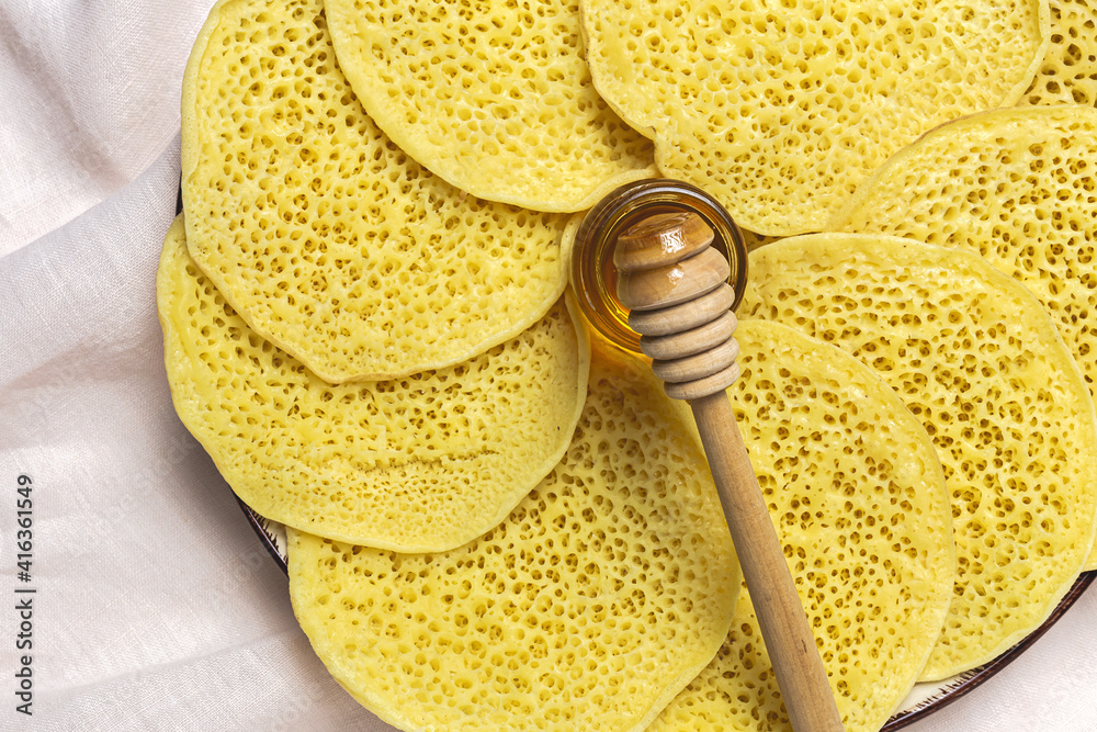 Homemade traditional moroccan baghrir with honey, strawberries and mint from above