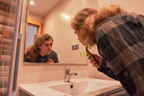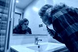 Handsome Caucasian man shaving his beard with a trimmer in a bathroom