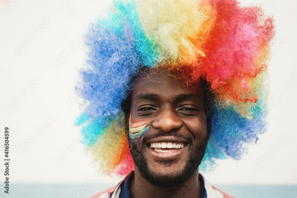 Happy young african man wearing lgbt rainbow flag wig - Focus on face