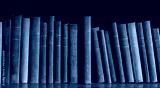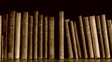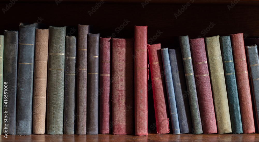 Old books on wooden shelf , colorful collection of antique books background