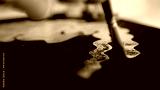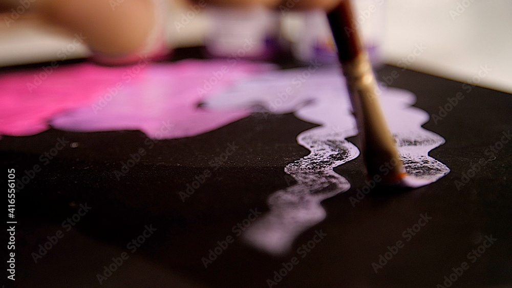 Artist's hand holds a paintbrush and draws a wavy line of pink or lilac on the black canvas. Close view. Pink color of oil paint or watercolor. Acrylic drawing concept, artist work