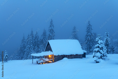 Fantastic winter landscape with glowing wooden cabin in snowy forest. Cozy house in Carpathian mountains. Christmas holiday concept