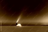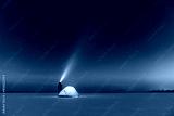 Tourist with flashlight near yellow tent lighted from the inside against the backdrop of incredible starry sky. Amazing night landscape. Tourists camp in snowy field. Travel concept