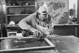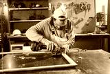 Male carpenter working on old wood in a retro vintage workshop.