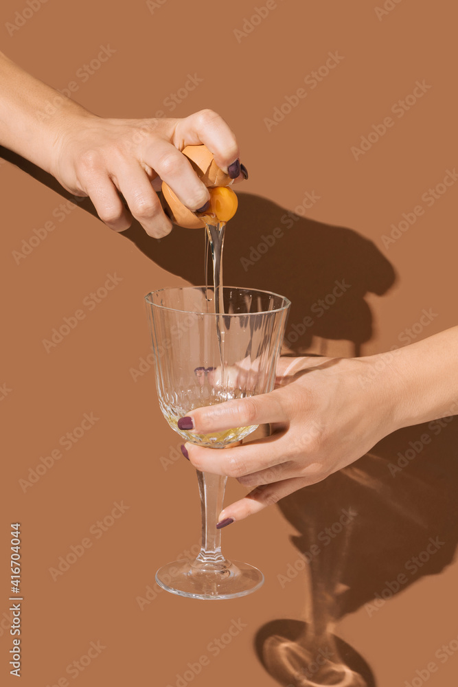 2021 Easter unique real life composition. Eggs with beautiful woman hand and champagne glass. Minimal retro style concept.