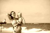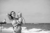 Close portrait of the pregnant mother hold blond toddler standing near sea with lighthouse on background
