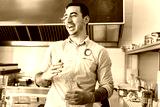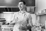 Young adult caucasian man entrepreneur standing at his fast food store in day smiling front view Chef in the kitchen having fun at work wearing protective medical gloves to prevent disease real people