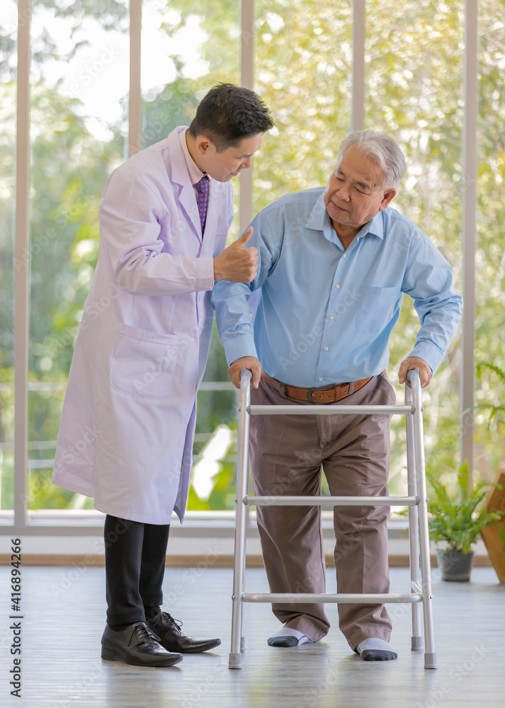 A young male asian doctor wearing white lab coat try to supporting his patient by holding his right arm when an old fat gray hair patient wearing light blue shirt and brown pants standing