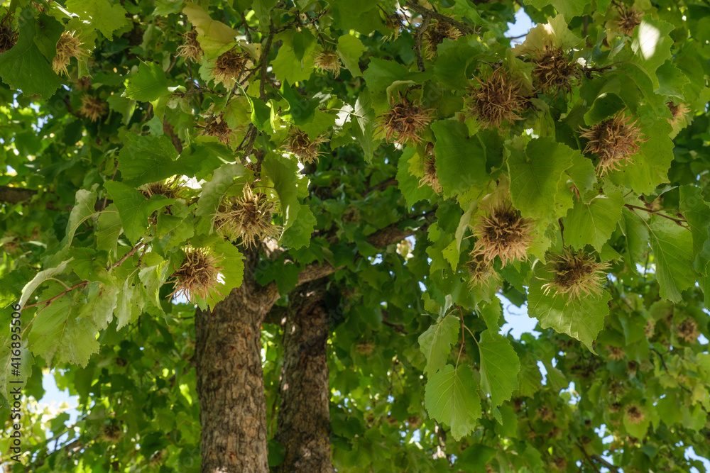 Hexennuss / Haselnuss: Nüsse, Fruchstände und grüne Blätter an den Zweigen der Baum-Hasel (La.: Corylus colurna)