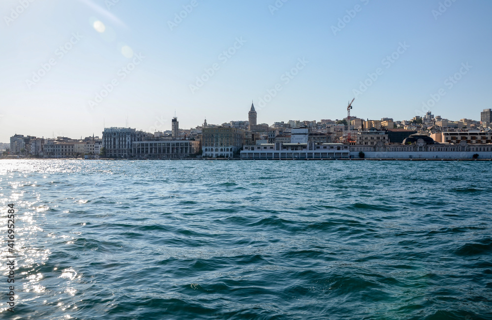 Scenic view with one of the symbolism of old Istanbul, Galata Tower at skyline from the seaside, landscape of Golden Horn, Turkey