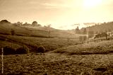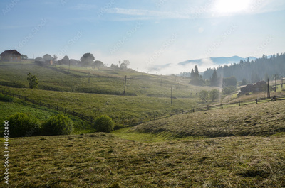 Carpathian village with foggy morning panorama of mountains valley at early summer morning. Beauty of Carpathians nature