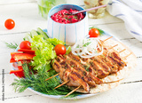 Grilled chicken kebab with beet hummus and pita, fresh vegetables on a white table. Grilled meat skewers, shish kebab on white background.