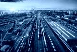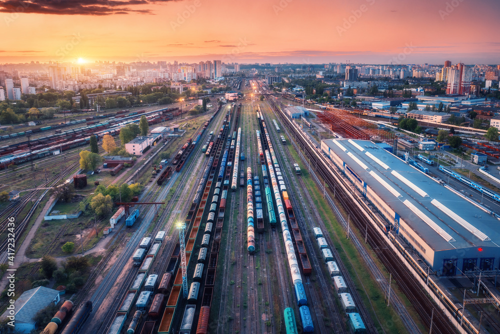 Aerial view of freight trains at sunset. Top view of railway station, wagons, railroad. Heavy industry. Landscape with train in depot, buildings, city, lights, colorful sky at night. Transportation