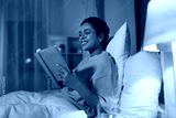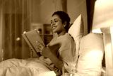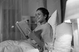 people, bedtime and rest concept - happy smiling young african american woman in glasses reading book in bed at home at night