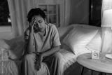 people, bedtime and rest concept - stressed african american woman having headache in bed at night