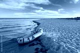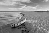 Yellow packraft rubber boat with red padle on a sea coast. Packrafting. Active lifestile concept