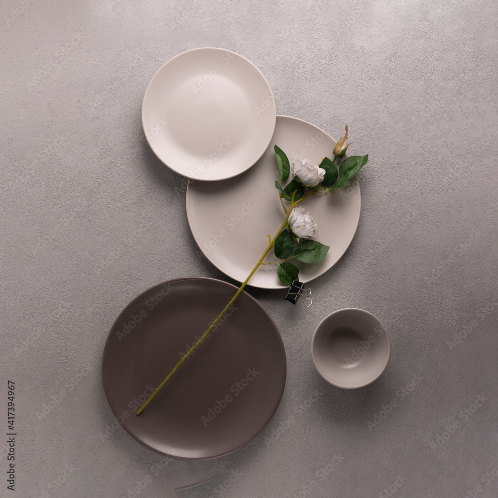 set of gray and brown plates, rose flower in pastel colors. Square composition