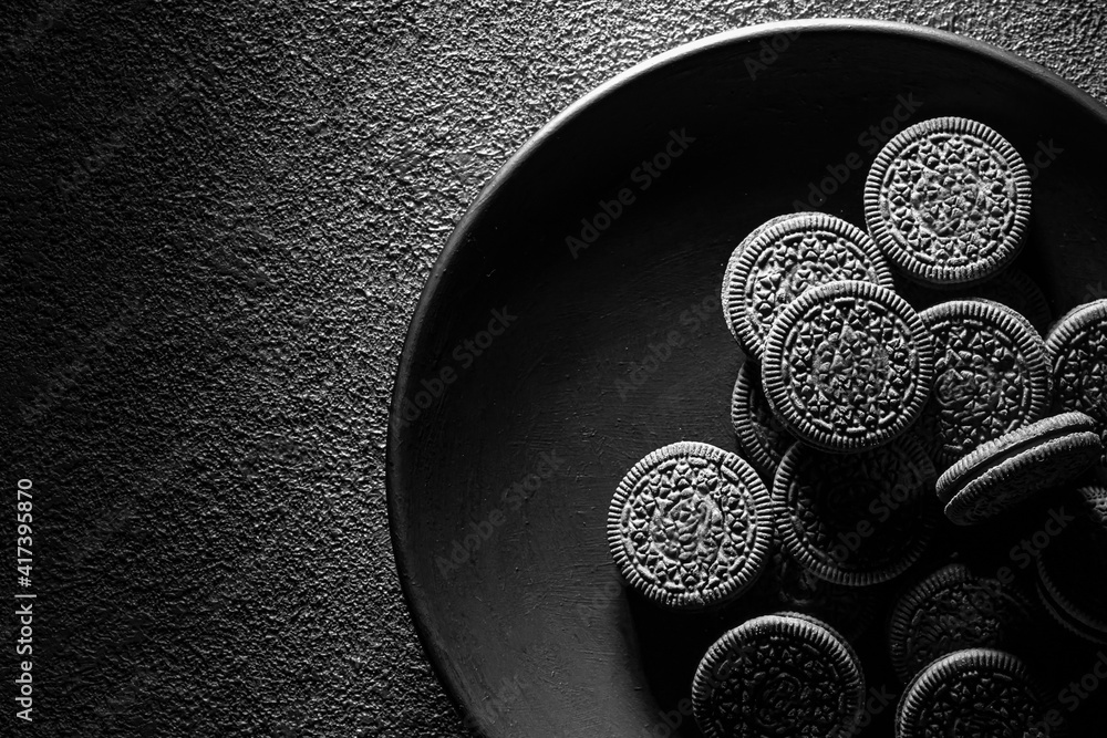 cookies in a black plate, art food photography, copy space close-up