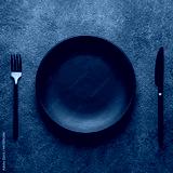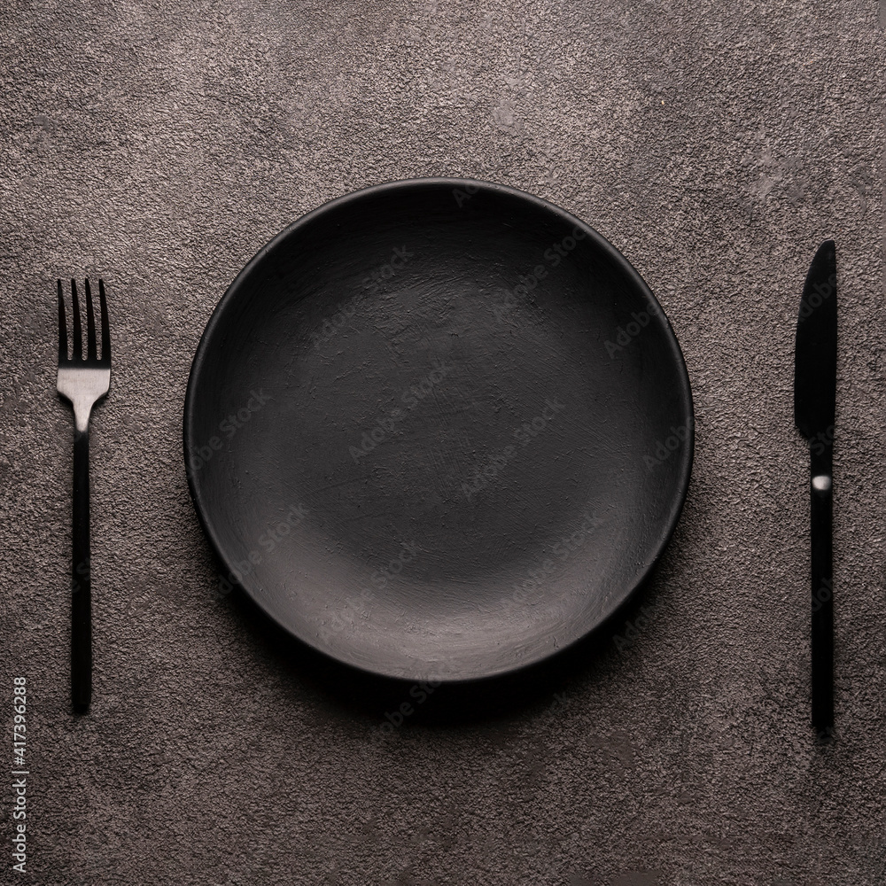 black empty plate and cutlery, fork and knife, on a dark textured background. Mockup concept for the design of a restaurant menu, website or design. Square layout