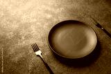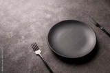 empty black plate, fork and knife on a dark background, horizontal photo