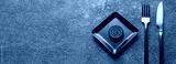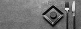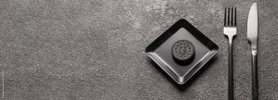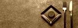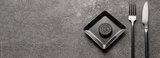 stylish dessert and cutlery-fork, knife and wooden small plate. A concept for a restaurant. copy space long panoramic photo