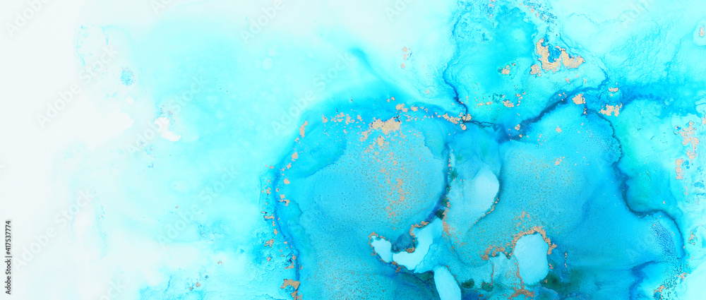 art photography of abstract fluid art painting with alcohol ink, blue and gold colors