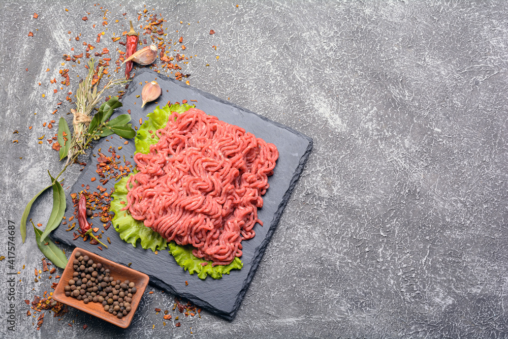 Dark culinary background with a wooden chopping board along with garlic, rosemary, bay leaves, pepper.onions and aromatic seasonings.view from the top.