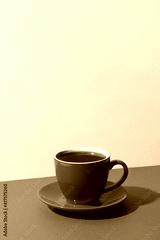Red cup of coffee and beans on color white and red background. Vertical format with negative space.